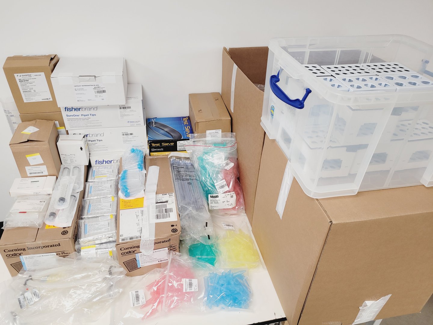 Pallet of Assorted Plastic and Glass Consumables - Fisherbrand - Corning - Lonza