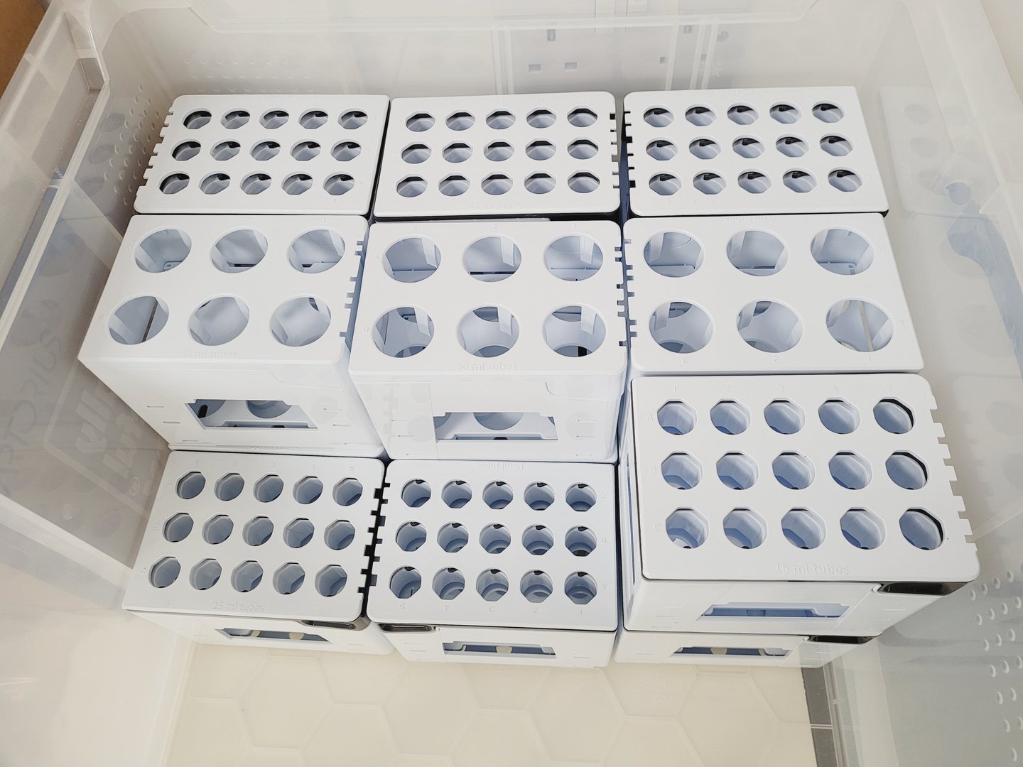 1x Box of test tube racks 6x 50 mL and 10x 15 mL - no maker's name or part number